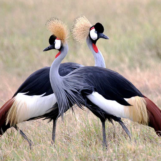 Венценосные журавли разбиваются на пары и образуют семьи - высиживают яйца оба родителя.