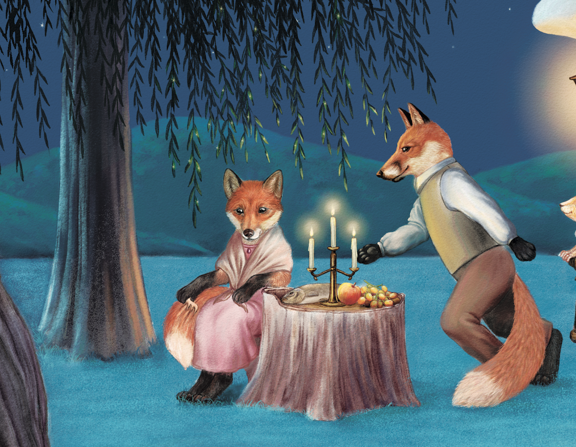 Хозяин Лис очень любит свой "Ресторан под большой Ивой". Ресторанчик небольшой (конечно, всего один стол), но очень приятный, и всегда еда вкусная. Лис очень ним гордится. Сейчас главный гость - красавица-Лисица, поэтому Лис ей подал к столу лучшие свои блюда - фрукты и фирменную рыбу от дядюшки Выдры.
