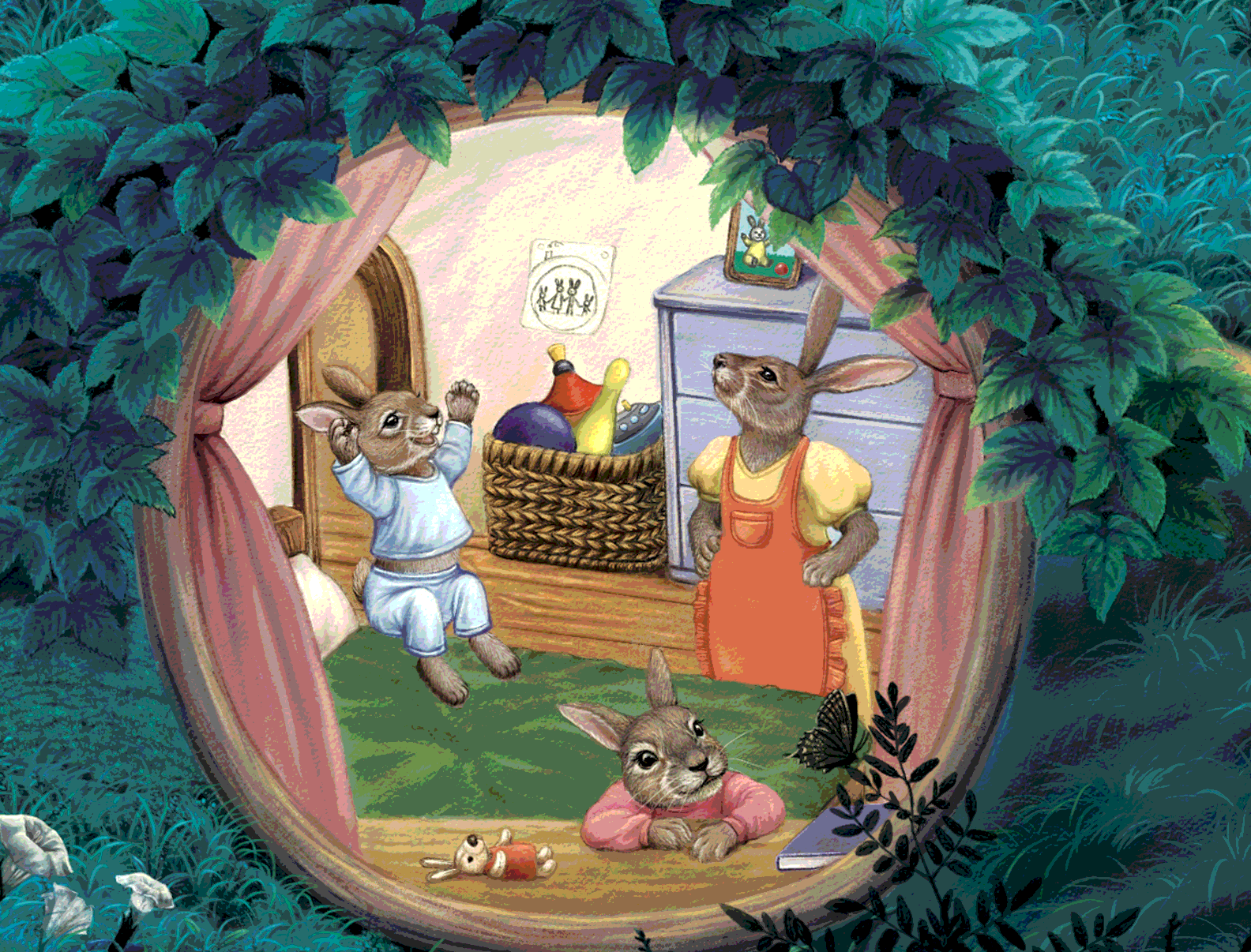 Недалеко от озера и главного Дерева живет семья зайцев. Мама, Папа и двое детишек. Детишки-шалунишки бегали весь день с малышом Енотом на детской площадке, вот мама их уже накормила ужином, уже и игрушки собраны, и книжку зайчата почитали. Настало время укладываться в кровать. Но не тут-то было! Детишки никак не хотят ложиться спать, прыгают, танцуют, девочка-Зайчишка даже смотрит в окошко и мечтает о принце.
