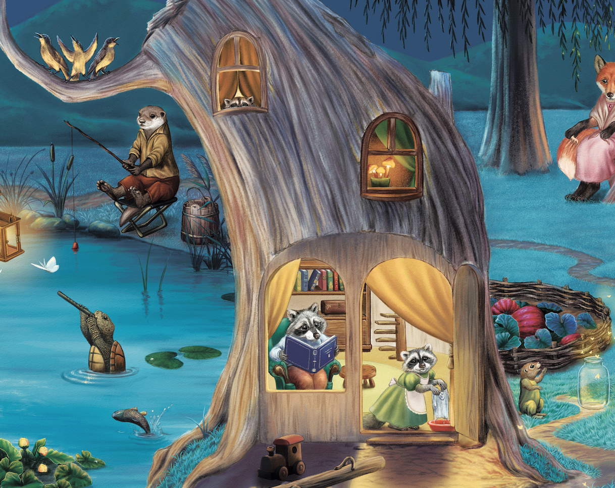 Это был прекрасный вечер, папа-Енот читал сыну книгу, мама-Енотиха наводила дома красоту. Но вот что-то их отвлекло, да настолько, что малыш со всей прыти побежал к себе в детскую на второй этаж, чтоб получше разглядеть, а что же происходит на Лугу?