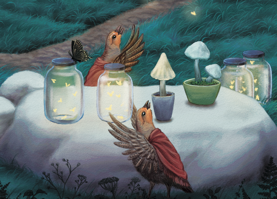 Какое же село без ярмарки, даже если село - Сказочный Луг? Каждый вечер птички-подружки устраивают ярмарку, где продают светлячков и лампочки-грибы. Ну просто потому что все лампочки в нашем Сказочном Луге работают только одну ночь. Купил светлячков, почитал книгу, перед сном выпусти, пусть дальше летают! А завтра, пожалуйста, покупай снова.