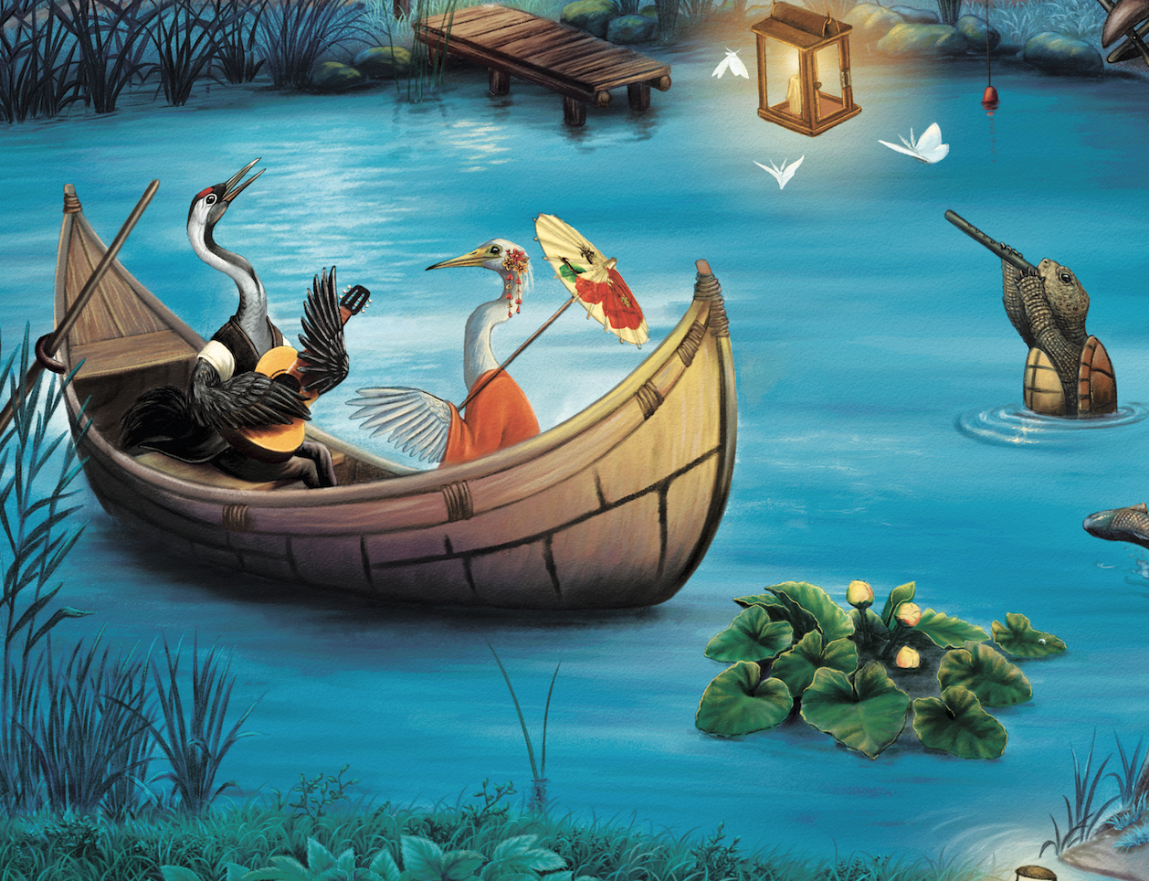 Молодой Журавль позвал на прогулку девушку-Цаплю, и не просто на прогулку, а на МУЗЫКАЛЬНУЮ прогулку! Играет серенаду он не сам, ему подпевают соловьи, и даже друг-Черепаха достал дудочку и подыгрывает гитаристу!